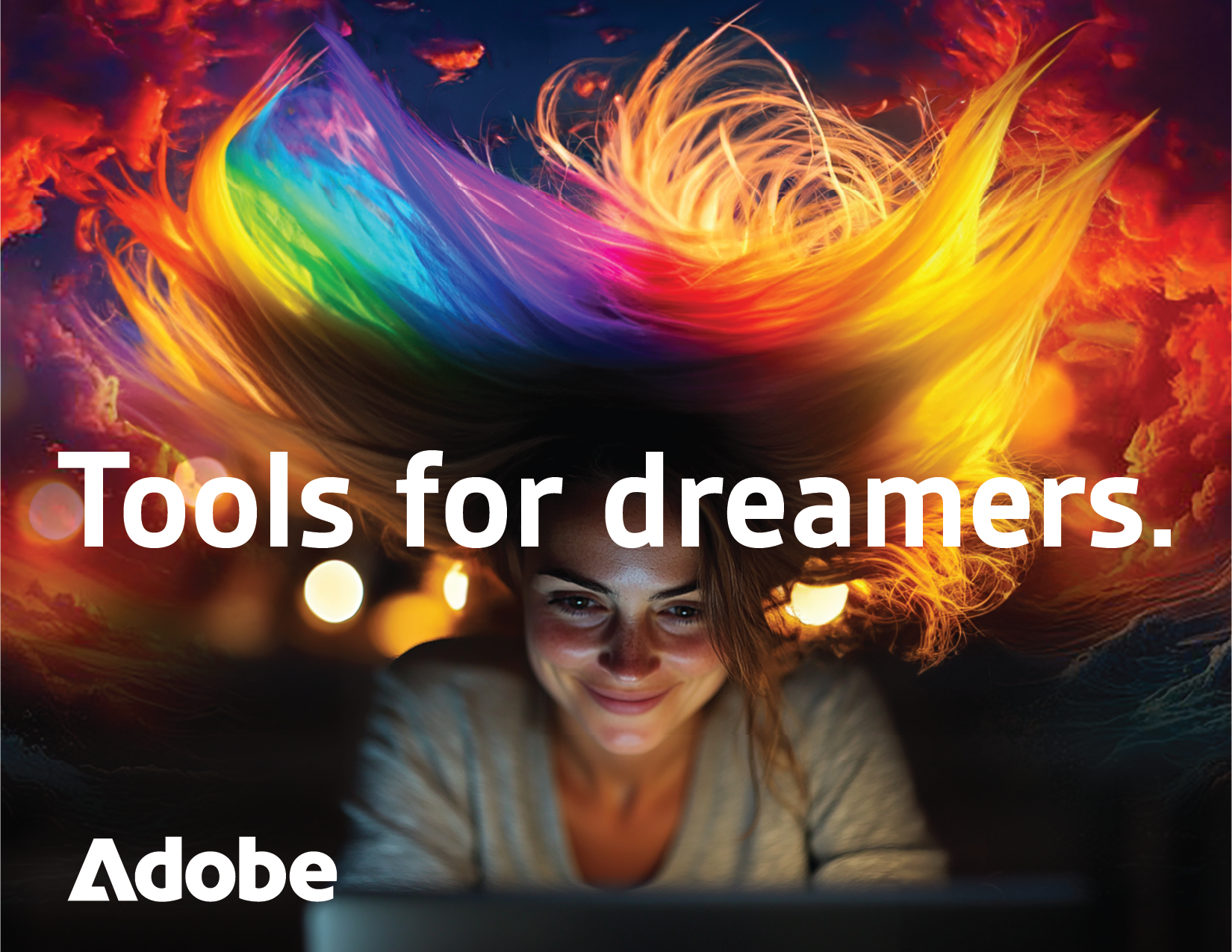 The bottom half of each composition anchors us in reality — the creator at their device — while the upper half visualizes pure imagination, symbolizing the worlds Adobe helps bring to life.